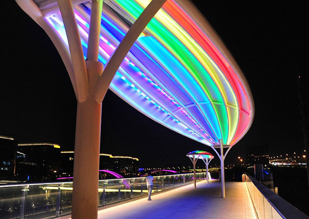 进博会期间,如何确保海内外宾客快速有序地抵达主场馆?如何让市民观展更加便利?交通保障无疑是重中之重。连接虹桥商务区核心区与国家会展中心的二层步廊竣工,从虹桥交通枢纽步行至场馆的时间由1个多小时缩短至20分钟。入夜,主题为“七彩聚虹、梦想筑桥”的步廊灯光秀简洁、大气、典雅、亮丽,营造出梦幻世界。