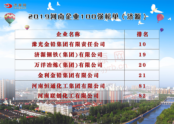 在此次全省企业百强评选中,济源豫光金铅集团有限责任公司、济源钢铁(集团)有限公司、万洋冶炼(集团)有限公司、金利金铅集团有限公司、河南恒通化工集团有限公司和河南联创化工有限公司入选,分列第10、19、20、21、81、82位。