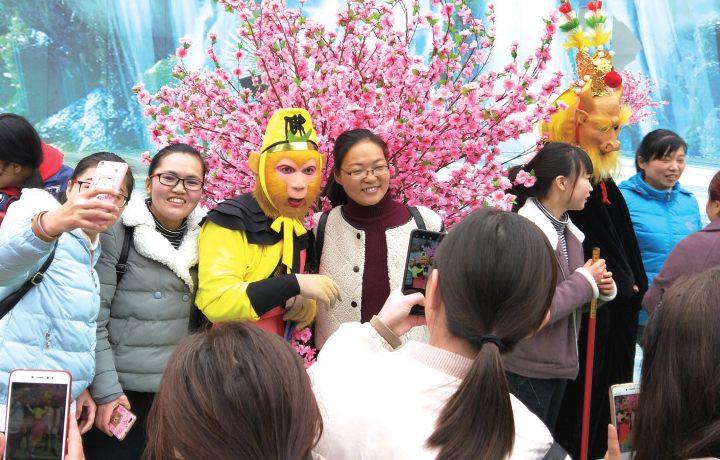 就这样,门外汉席方通过自己的努力入了门,演绎水平逐渐提高。2016年,五龙口景区组建了西游仙魔团,除席方所扮演的“美猴王孙悟空”外,还有“唐僧”“猪八戒”“沙和尚”等人物。团队的成员越来越多,西游仙魔团的人气也越来越高,他们自编自导自演“猴王保唐僧”“‘趣’经女儿国”“天竺收玉兔”等节目,一经推出,就成为游客们最喜爱、参与度最高的招牌节目。