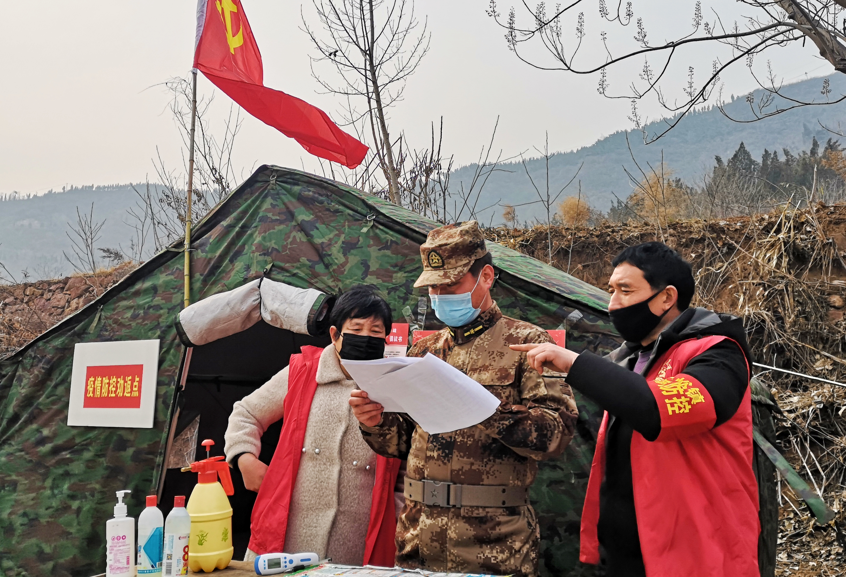 2月1日,大峪镇民兵贾述文(中)在偏看村指导疫情防控点党员干部做好值守工作。薛永亮 摄
