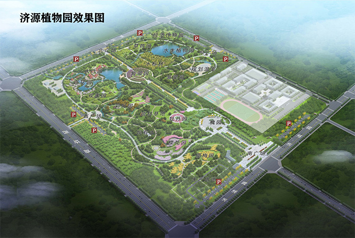 济源植物园位于济源西北部,西环路以东,北环路以南,济渎大街以北,南北长970米,东西长810米,总占地面积约952亩,总投资8800余万元。园区主要由“景观中轴”“片林”“经典植物园”三个片区组成。其中,绿化面积732亩,水系面积59亩,绿化用地比例达77%。