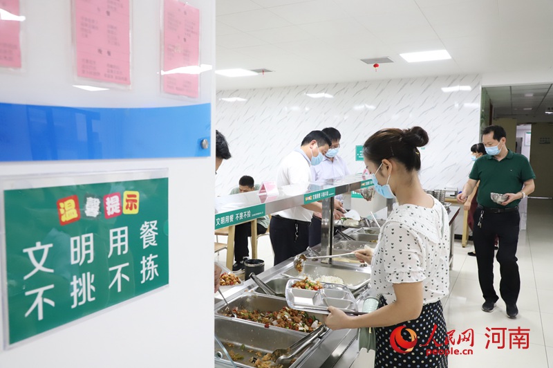 8月24日中午,宝丰县政府机关食堂就餐人员排队按需取餐。张明哲 摄