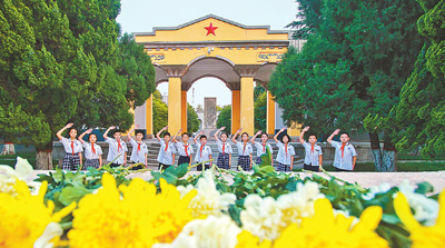 9月3日,小学生们来到河北邯郸晋冀鲁豫烈士陵园向左权将军墓敬礼,缅怀先烈。记者 史自强 摄