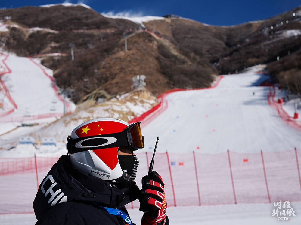 △延庆赛区高山滑雪中心,为完成赛道造雪任务,山地运行团队前后投入150余台造雪机,27台压雪车24小时不间断作业。这是山地运行负责人吴高胜在指挥工作。(总台央视记者王哈男拍摄)