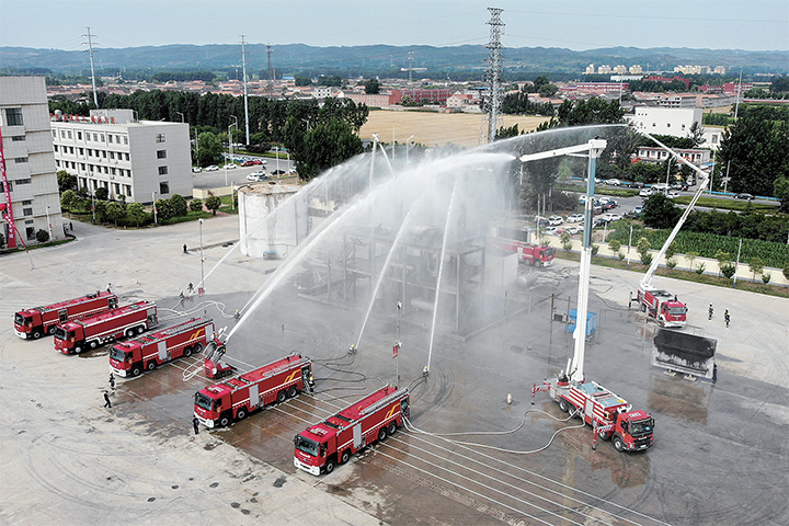 6月18日,在济源市消防救援支队实训基地,济源市消防救援支队正在进行模拟化工装置火灾应急救援展演。