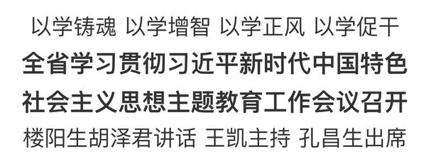 4月6日,全省学习贯彻习近平新时代中国特色社会主义思想主题教育工作会议召开,贯彻落实习近平总书记在学习贯彻习近平新时代中国特色社会主义思想主题教育工作会议上重要讲话精神和中央关于在全党深入开展主题教育的意见,安排部署我省主题教育工作。省委书记楼阳生、中央第九指导组组长胡泽君讲话,省长王凯主持,省政协主席孔昌生出席。