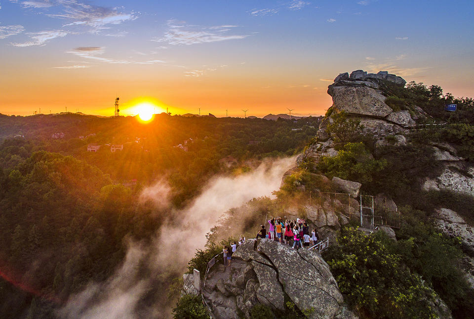 此时报晓峰上风从北来,与北上水汽交汇,只见云海蒸腾。东方红日穿云破雾,万丈霞光从云缝中穿出,照在报晓峰顶,云海中周围群山忽隐忽现,宛若仙境。