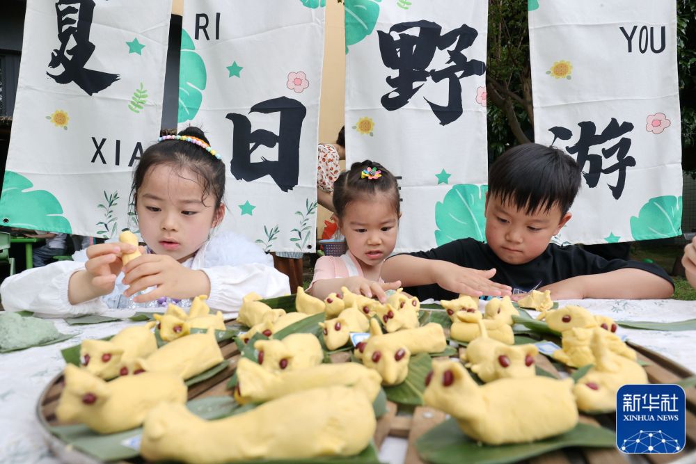 5月5日,浙江省湖州市德清县三桥幼儿园的小朋友在捏立夏狗。新华社发(谢尚国 摄)