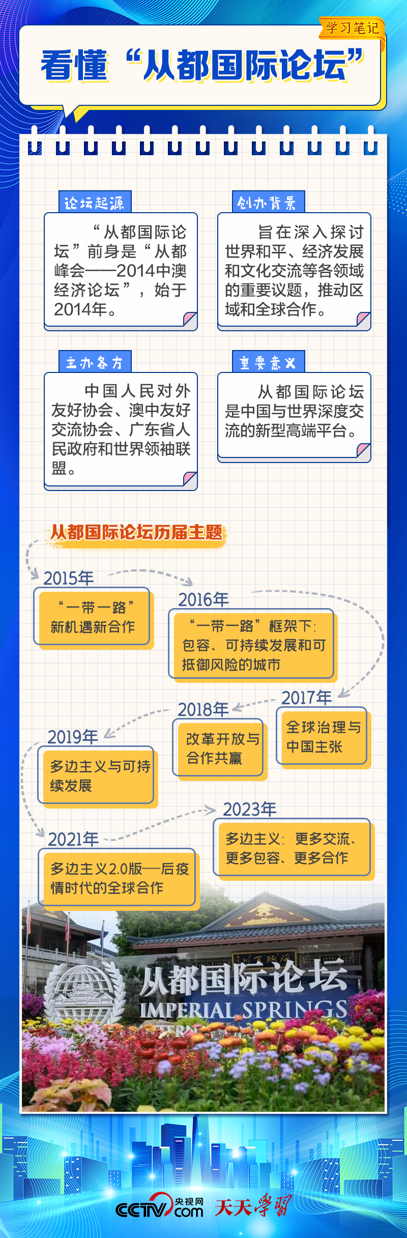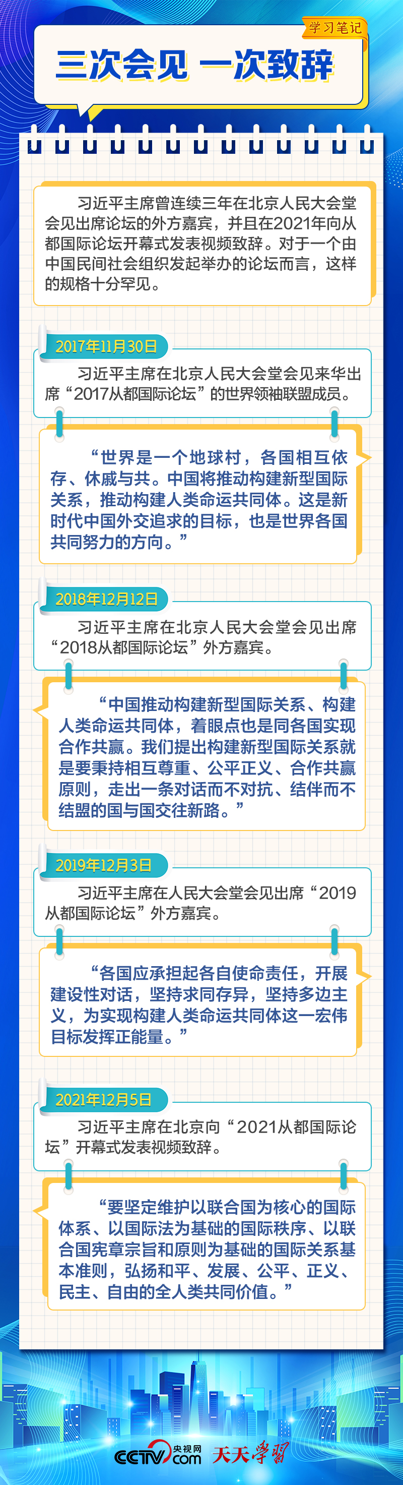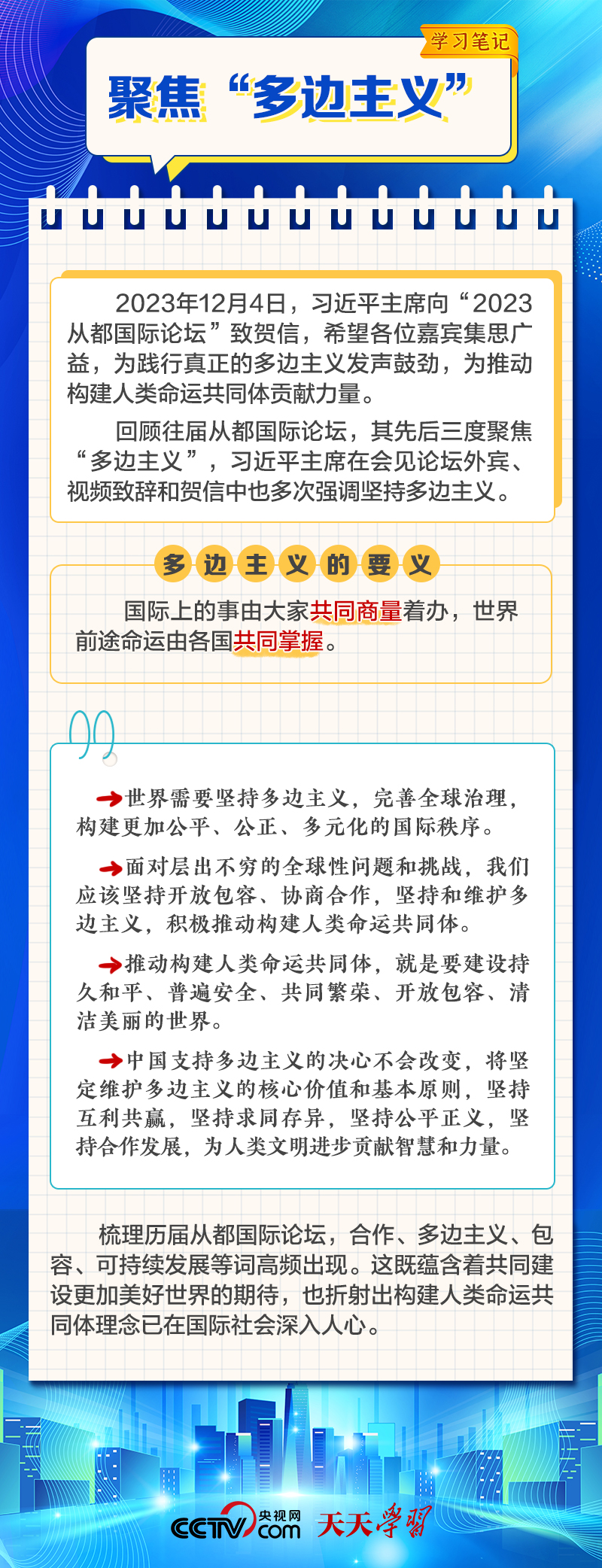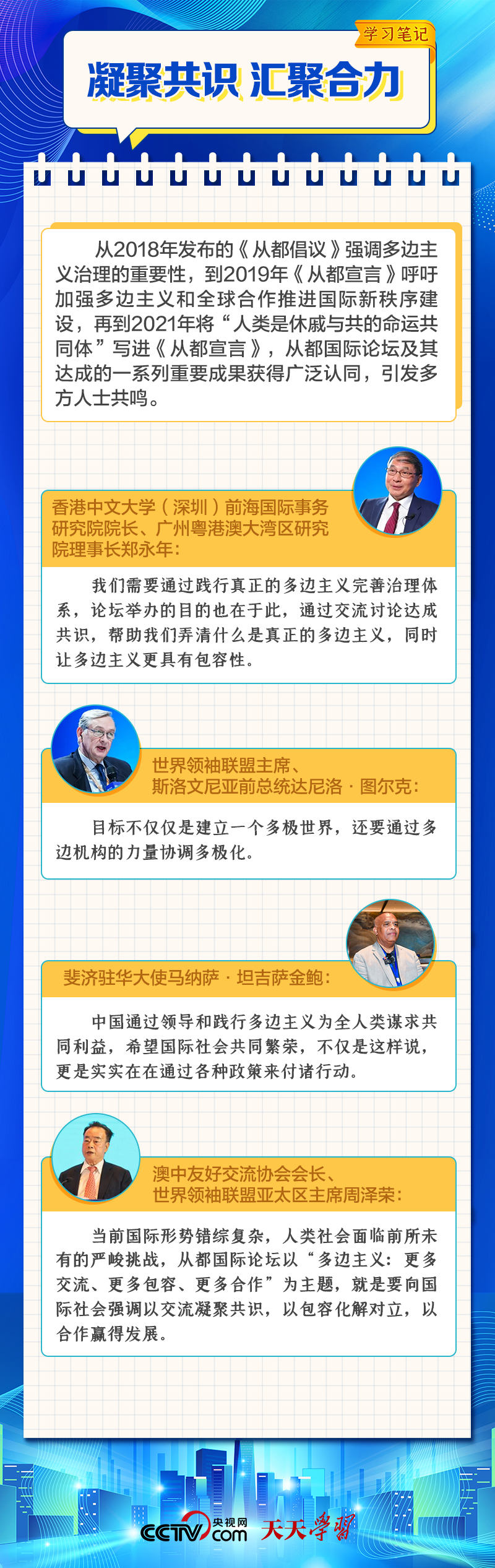 天天学习|12月4日,习近平主席在致“2023从都国际论坛”的贺信中强调,面对前所未有的世界之变、时代之变和历史之变,人类社会必须团结起来,坚持互学互鉴、开放包容、合作共赢,弘扬全人类共同价值,共同建设更加美好的世界。作为加深理解、推进共识、合作共赢的国际高端交流平台,从都国际论坛自2014年创设以来,已举办八届。多年来,从都国际论坛不仅成为了一扇观察和感知当代中国的窗口,更为完善全球治理贡献了智慧和力量。在践行真正的多边主义实践中,中国与世界相向而行,共进共赢。