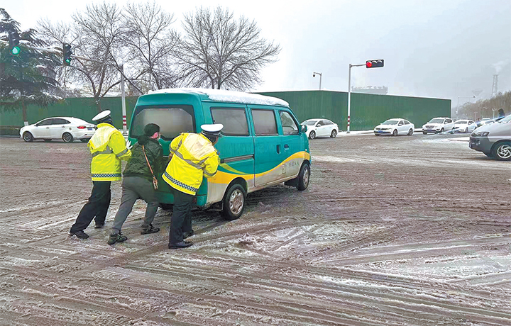 12月14日上午,我市出现降霰天气,相关部门及时出动,清理城区主干道积雪,确保道路畅通。宋伟峰 于军 摄