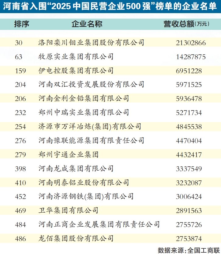 日前,全国工商联发布“2025中国民营企业500强”榜单,河南15家企业“榜上有名”,上榜数量在中部六省中排名第一。