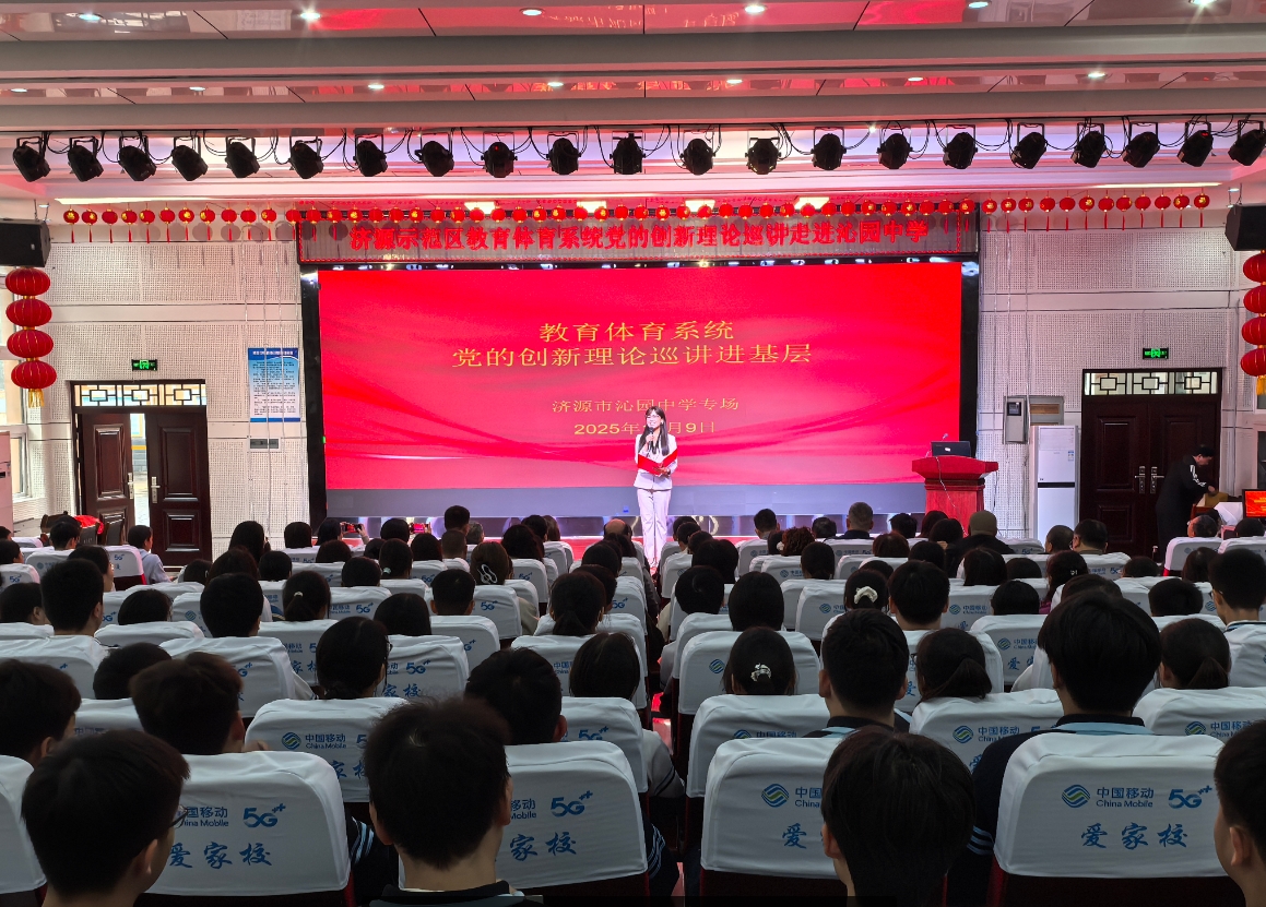 10月9日,沁园中学多功能报告厅激情涌动、掌声不断。济源示范区教育体育系统党的创新理论巡讲活动在此举行。来自特殊学校、山区、乡村等五名基层学校教师用动人事迹、质朴情感为沁园中学200余名师生送来一场“冒热气、接地气、聚人气”的党的创新理论盛宴。示范区教体局党建办工作人员翟宇峰、卢亚丽与沁园中学党总支书记李小强、校长马军、200余名师生共同见证了这场理论宣讲盛宴,奏响了“理论宣讲入心田,追求卓越办强校”的时代强音。
