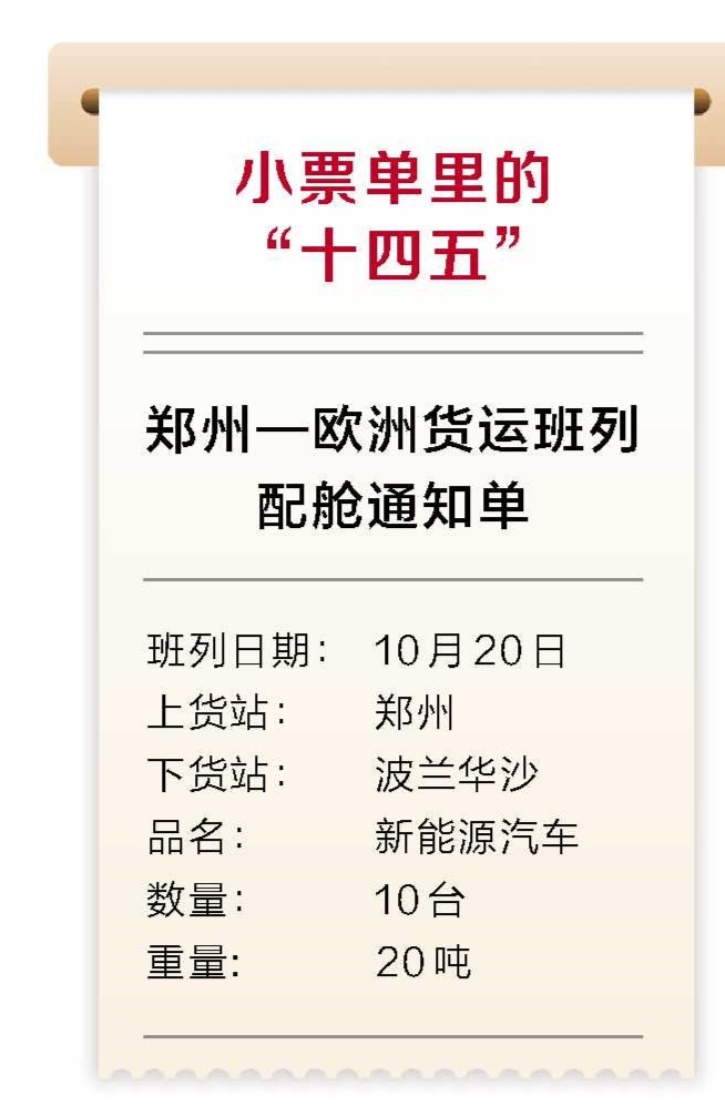 10月16日,中豫港务集团郑州国际陆港的配舱通知单上,中英文双语记录着这样一条中欧班列的订舱信息:班列日期10月20日,上货站郑州,下货站波兰华沙,品名新能源汽车,数量10台。