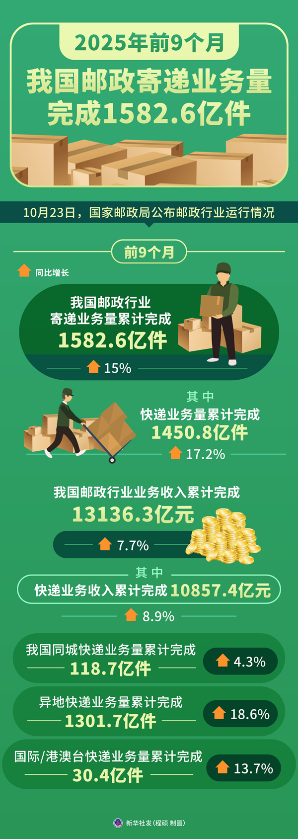 新华社北京10月23日电(记者 叶昊鸣)记者23日从国家邮政局获悉,前9个月,我国邮政行业寄递业务量累计完成1582.6亿件,同比增长15%。其中,快递业务量累计完成1450.8亿件,同比增长17.2%。