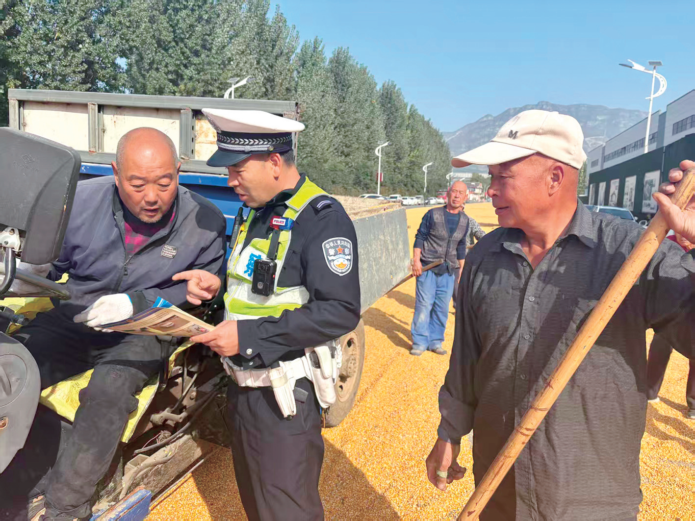 “大叔,这里车流密集,占道晒粮不安全,咱们找个更合适的地方吧。”“周围这些石块、木棍,不仅影响车辆通行,更是巨大的安全隐患,夜间行车尤其容易引发事故……”连日来,济源交警深入部分村庄,开展秋收时节交通安全宣传。他们不仅耐心劝导占道晒粮的村民,还主动帮助大家将粮食转移至不影响交通的空地,叮嘱村民要遵守交通规则,确保秋收、安全两不误。
