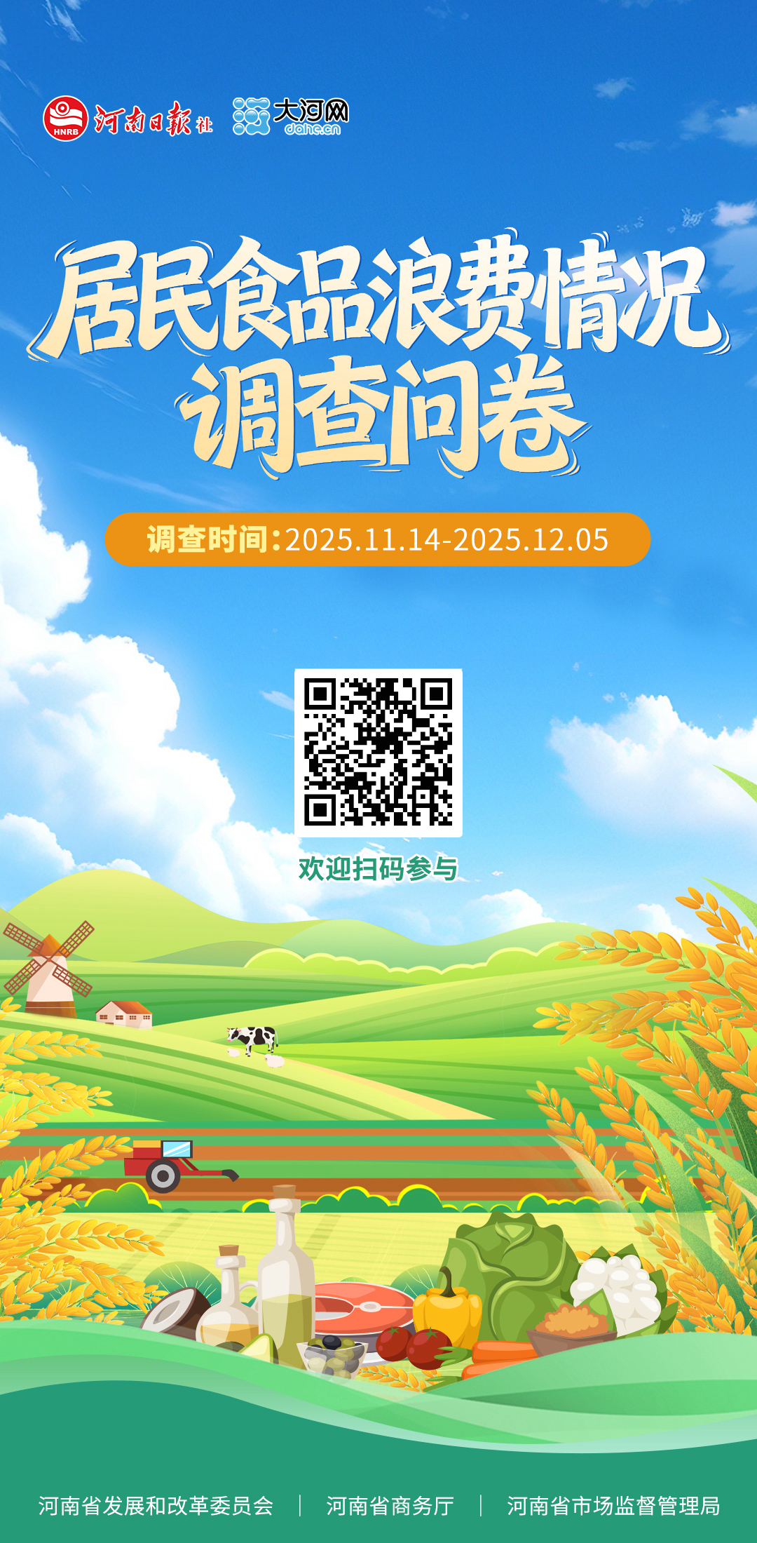 节约粮食是中华民族的传统美德。为落实《中华人民共和国反食品浪费法》有关要求,更好地推进反食品浪费工作,按照国家工作部署,省发展改革委会同省商务厅、省市场监管局,联合大河网组织开展居民食品浪费情况调查,调查时间为2025年11月14日至2025年12月5日。