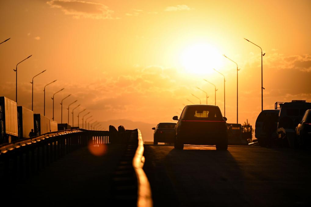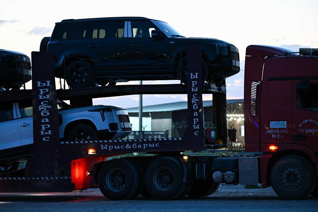 5月22日,运输公司工作人员驾驶从中国进口的新能源汽车驶出哈萨克斯坦口岸,驶向扎尔肯特镇的中转停车场。新华社记者李任滋摄