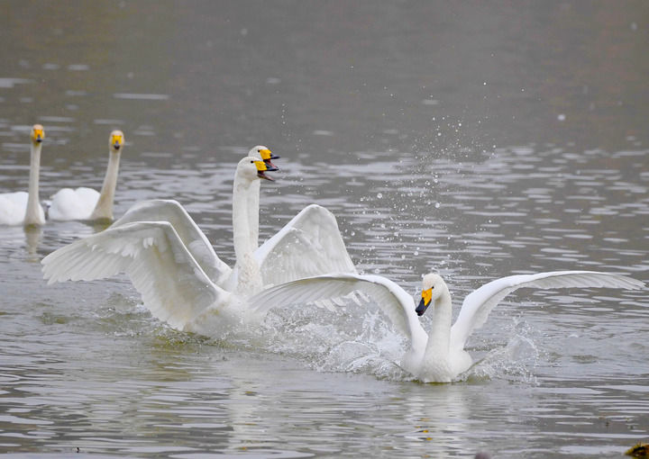 大天鹅在三门峡黄河湿地嬉戏(2024年11月14日摄)。新华社记者 郝源摄