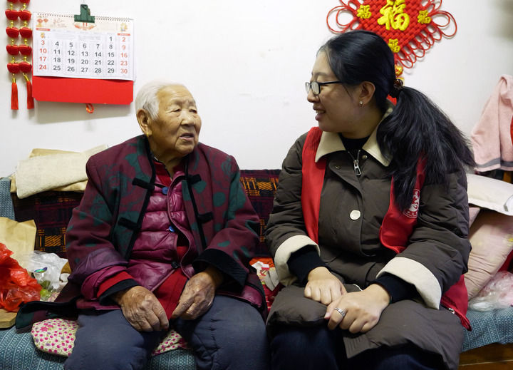 2024年11月29日,在郑州市纬三路10号院,经八路街道省委社区的网格长(右)在走访一名独居老人。新华社记者 李嘉南 摄