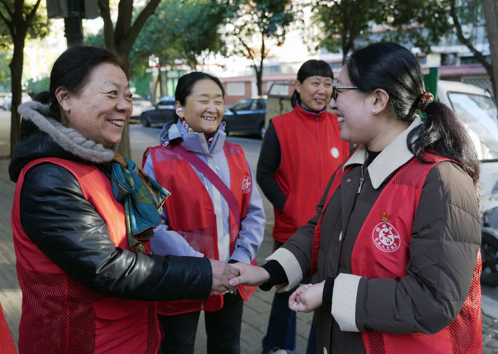 2024年11月29日,在郑州市纬一路3号院门口,经八路街道省委社区的网格长们在交流当日的工作。新华社记者 李嘉南 摄