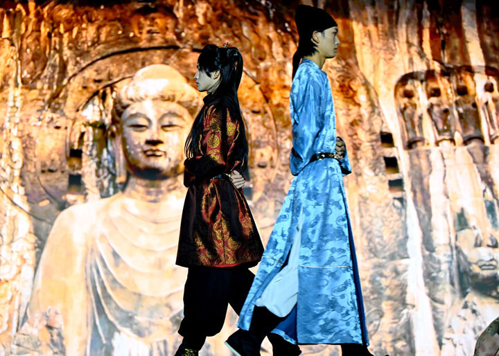 10月29日,在河南省洛阳市洛邑古城,演员身着华服走秀。新华社记者 郝源摄