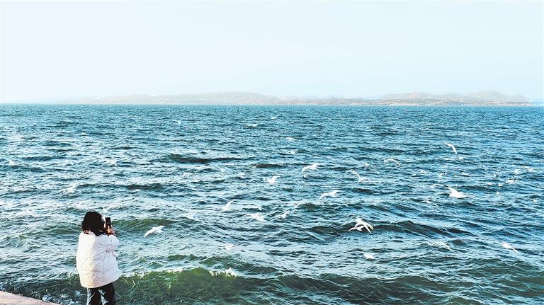 游客在丹江口水库观看海鸥。郝凯 摄