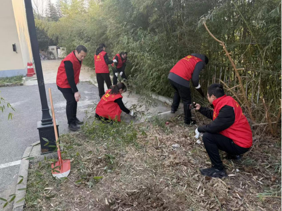 活动现场,党员志愿者们热情高涨,分工协作,纷纷拿起锄头、铁锹、手套等工具,投入到热火朝天的劳动中。大家重点对菜地区域及周边滋生的杂草、杂竹进行了彻底清除。志愿者们或俯身徒手拔草,或挥动锄头松土,或清理搬运枯枝杂物,不放过任何一个卫生死角。尽管天气寒冷,但大家干劲十足,充分发扬了不怕脏、不怕累的团结协作精神。经过数小时的辛勤劳作,餐厅旁的土地面貌焕然一新,原本杂乱的草丛和竹丛被清理得干干净净,土地得到了平整和疏松,为接下来的土壤休整和春季作物种植创造了良好条件。