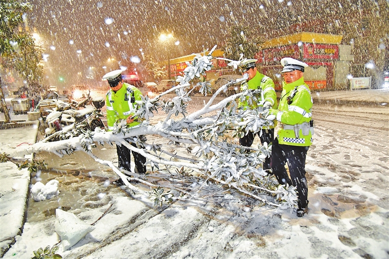 雨雪天气来袭,洛阳市公安局交通管理支队民辅警在路面清除树障,保障群众出行安全。田贝贝 摄
