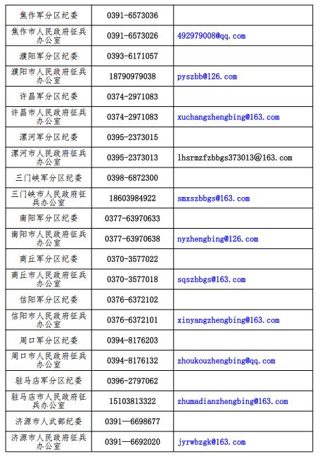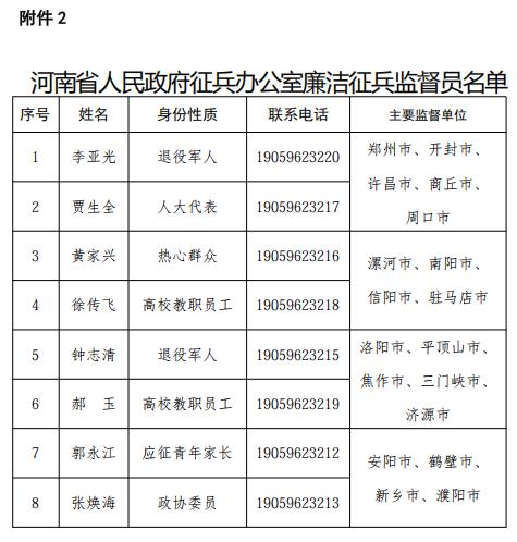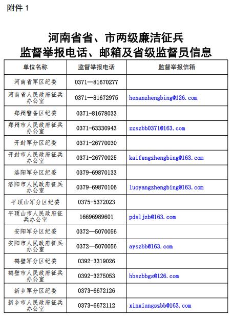 河南省省市两级廉洁征兵监督举报电话、信箱及省级监督员信息