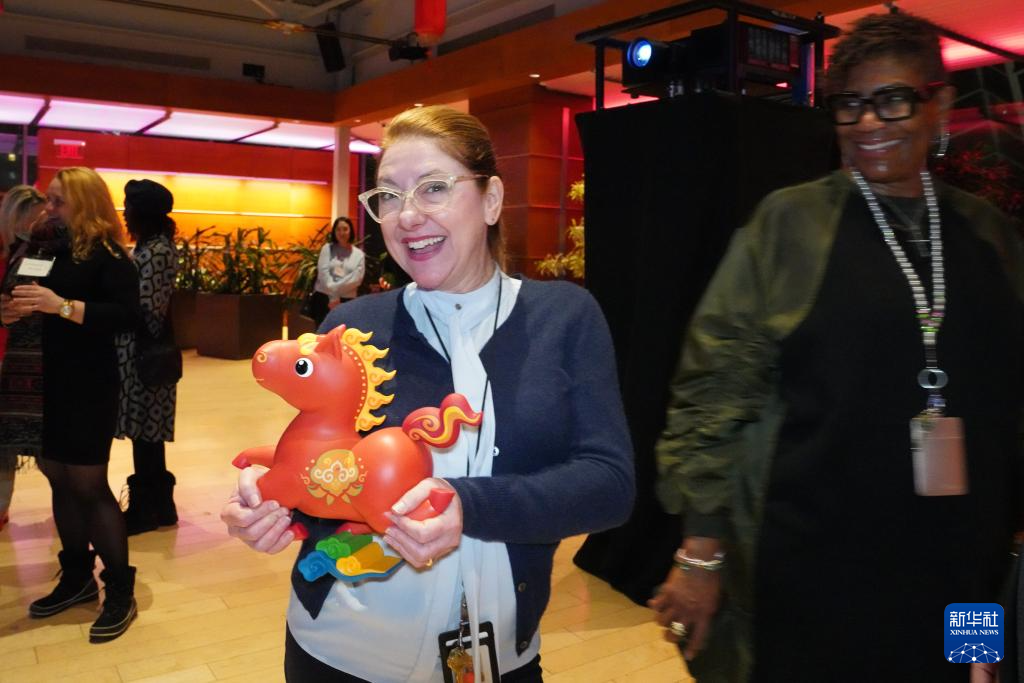 1月28日,在美国费城,一名女子在“你好!中国”旅游推介系列活动上展示吉祥物幸运马。