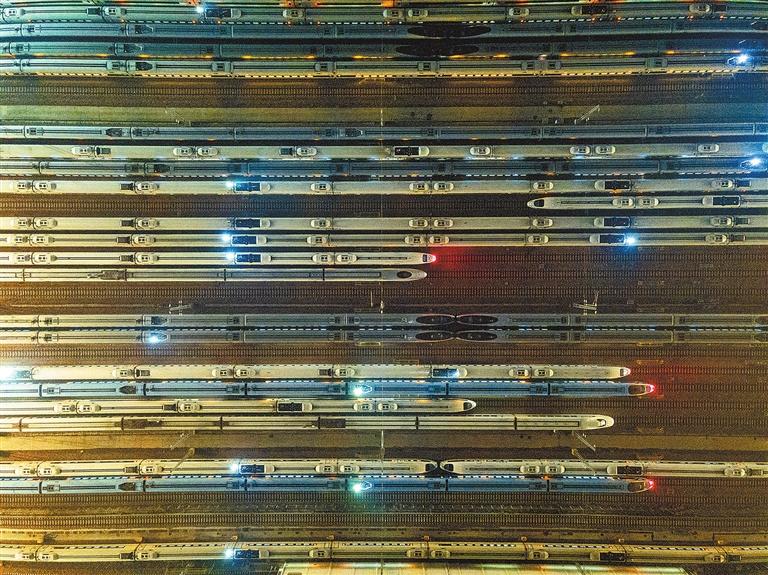 2月1日凌晨,中国铁路郑州局集团有限公司郑州动车段停车场内,一列列完成当日运营任务的动车组陆续返回。
