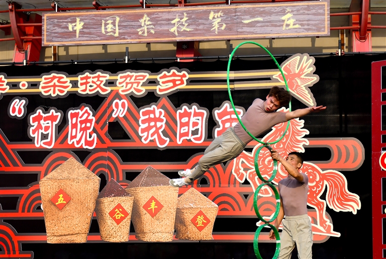 “俺村有11支杂技队伍,400多口人吃这碗饭。”乔家班第七代传承人刘闯专程从外地赶回来参演“村晚”,今年31岁的他谈起杂技事业眼里有光,“大伙儿平常在福州、广州、上海等城市演出,不断琢磨新花样,加入舞美、编排故事。这次回到村里,站在自家门口,虽然演出更乡土,却觉得真正落到了根上。”