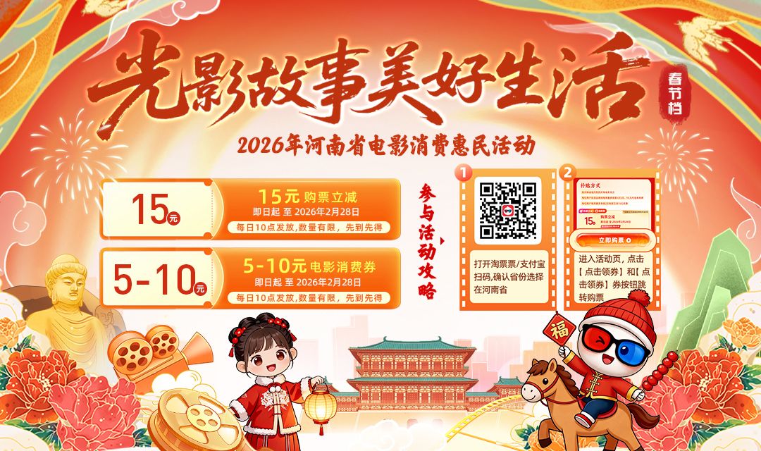 2026年马年春节临近,为丰富节日期间群众文化生活,促进电影市场消费,河南省委宣传部(省电影局)联合淘票票平台推出“光影故事 美好生活”观影消费补贴惠民活动,覆盖河南省内所有正常营业影院及春节档全部影片。具体领券规则及操作步骤如下:打开淘票票APP或支付宝,扫码后选择河南省,即可参与领券;15元购票立减券、5—10元电影消费券,均自即日起至2026年2月28日,每日10点发放,数量有限、先到先得。