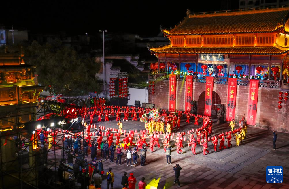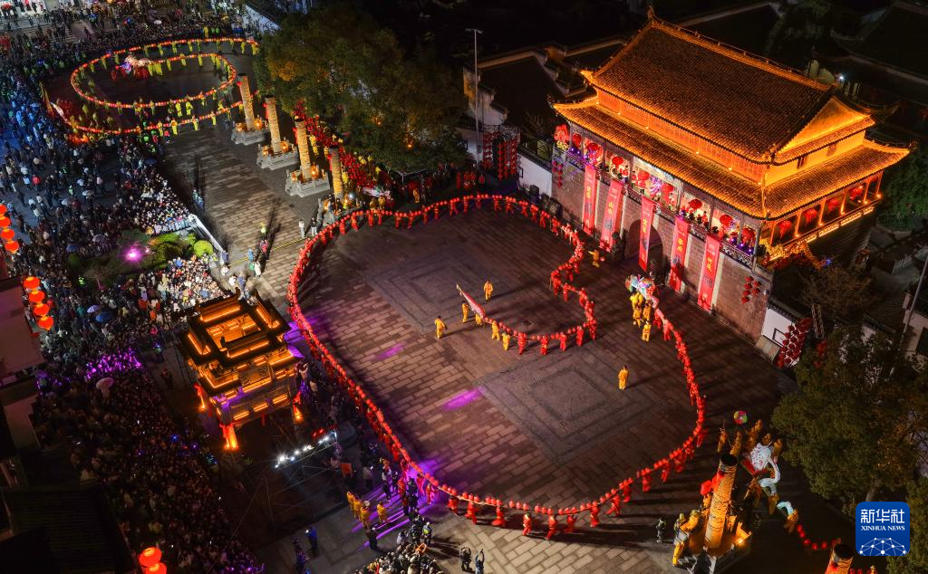 农历正月十二,安徽省黄山市休宁县“福满状元城”舞龙大会在状元广场热闹开演。百米长的非遗民俗徽州板凳龙在街巷间穿梭游动,与钟鼓楼相映成辉,喜迎元宵佳节。新华社发(施亚磊摄)