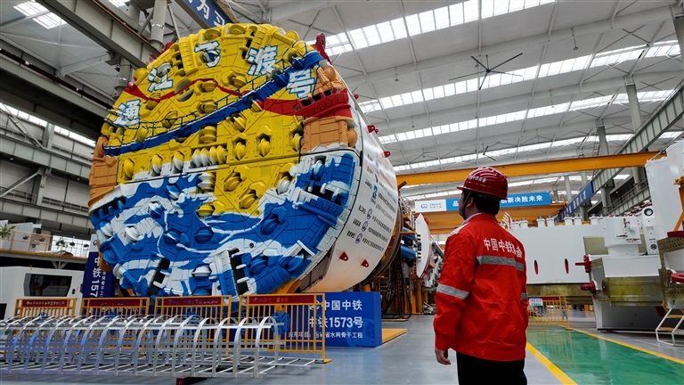 中铁装备集团副总工程师、技术中心主任贺飞正在查看即将发往吉林省中西部供水一期工程的盾构机。本报全媒体记者 陈浩 摄