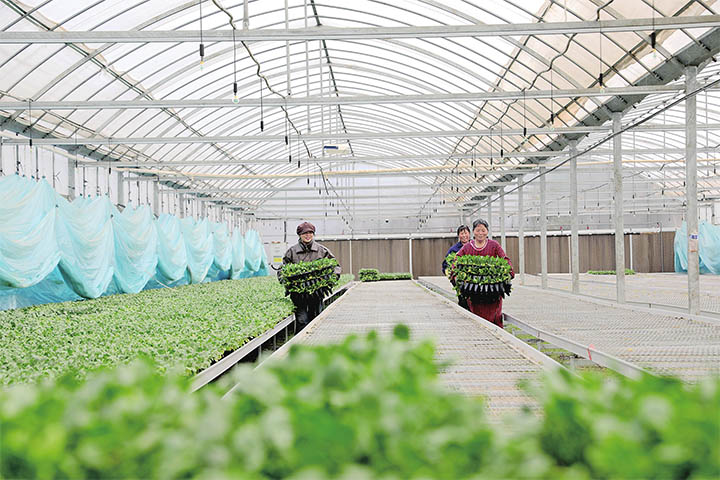 3月5日,农民在梨林镇北瑞村大棚里搬运萝卜种苗。