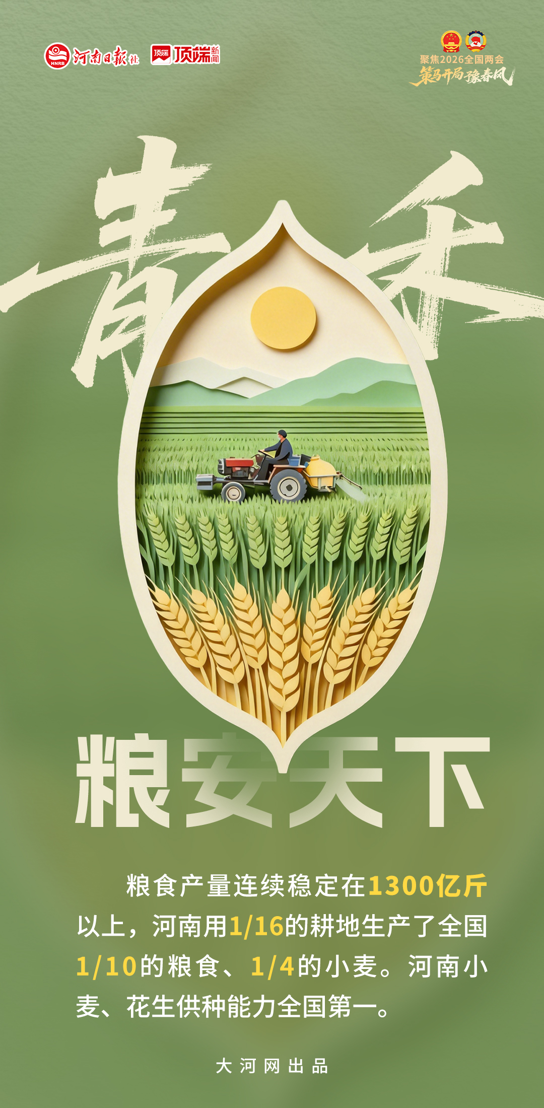 “中原熟,天下足”,河南作为农业大省,肩负着“扛牢粮食安全责任”的重任和乡村振兴的历史使命。粮食总产量连续9年站稳1300亿斤台阶,端稳端牢“中国饭碗”,“豫字号”食品正香飘全国、走向世界……这,就是河南的“食”力担当。