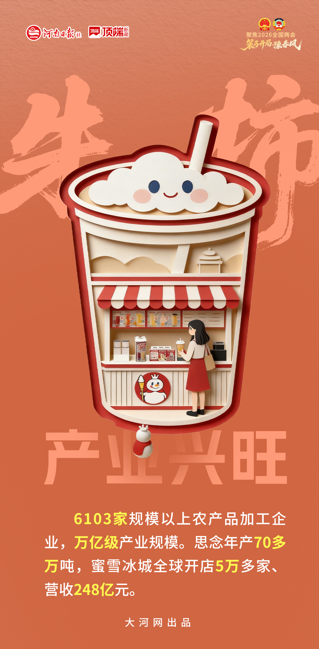 灵宝果农举起手机直播带货,40%线上销量,25亿元电商销售额,200亿元品牌价值——手机成了新农具,直播成了新农活。无人驾驶播种,厘米级精度,植保无人机作业。政府工作报告强调的“推进先进适用农机装备研发应用”,正在田野上变成现实。锅圈食汇、千味央厨、卫龙、蜜雪冰城——新兴“链主”企业加速涌现。一根辣条做成上市公司,一杯奶茶开遍全球5万家店、248亿元营收。18条产业链,6大产业集群,从“卖原料”到“卖产品”,河南农业正在产业链上实现价值跃迁。
