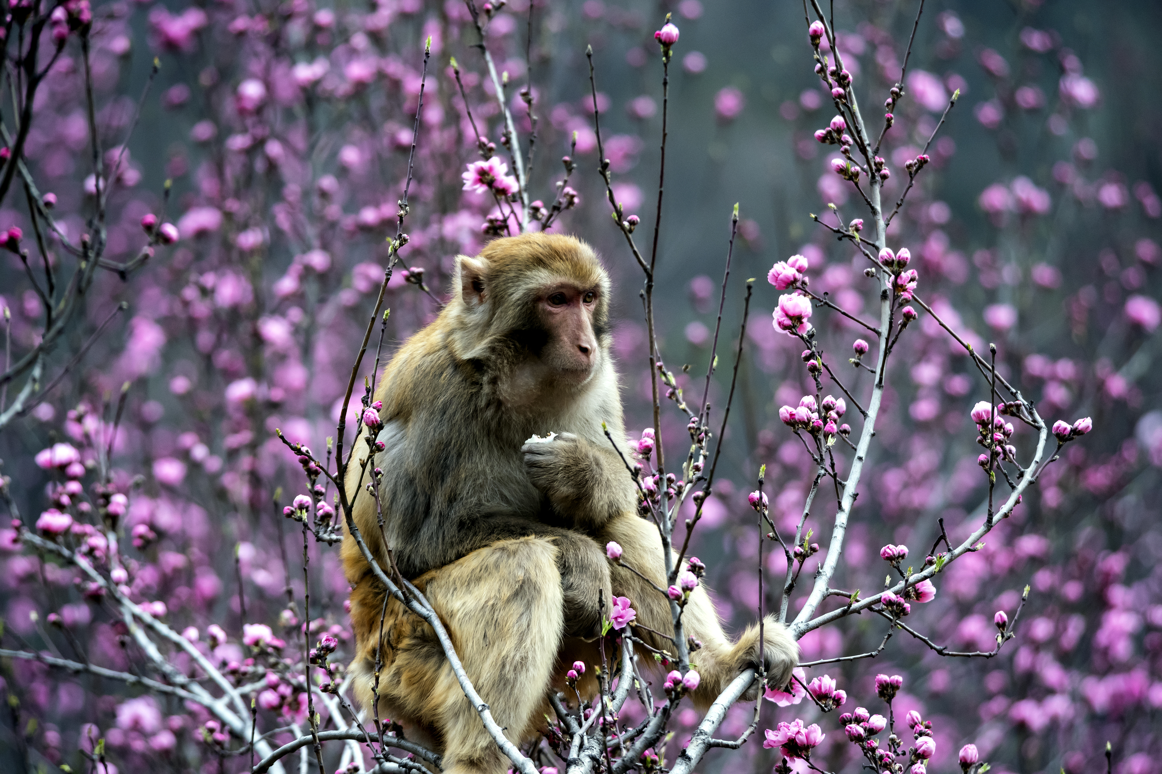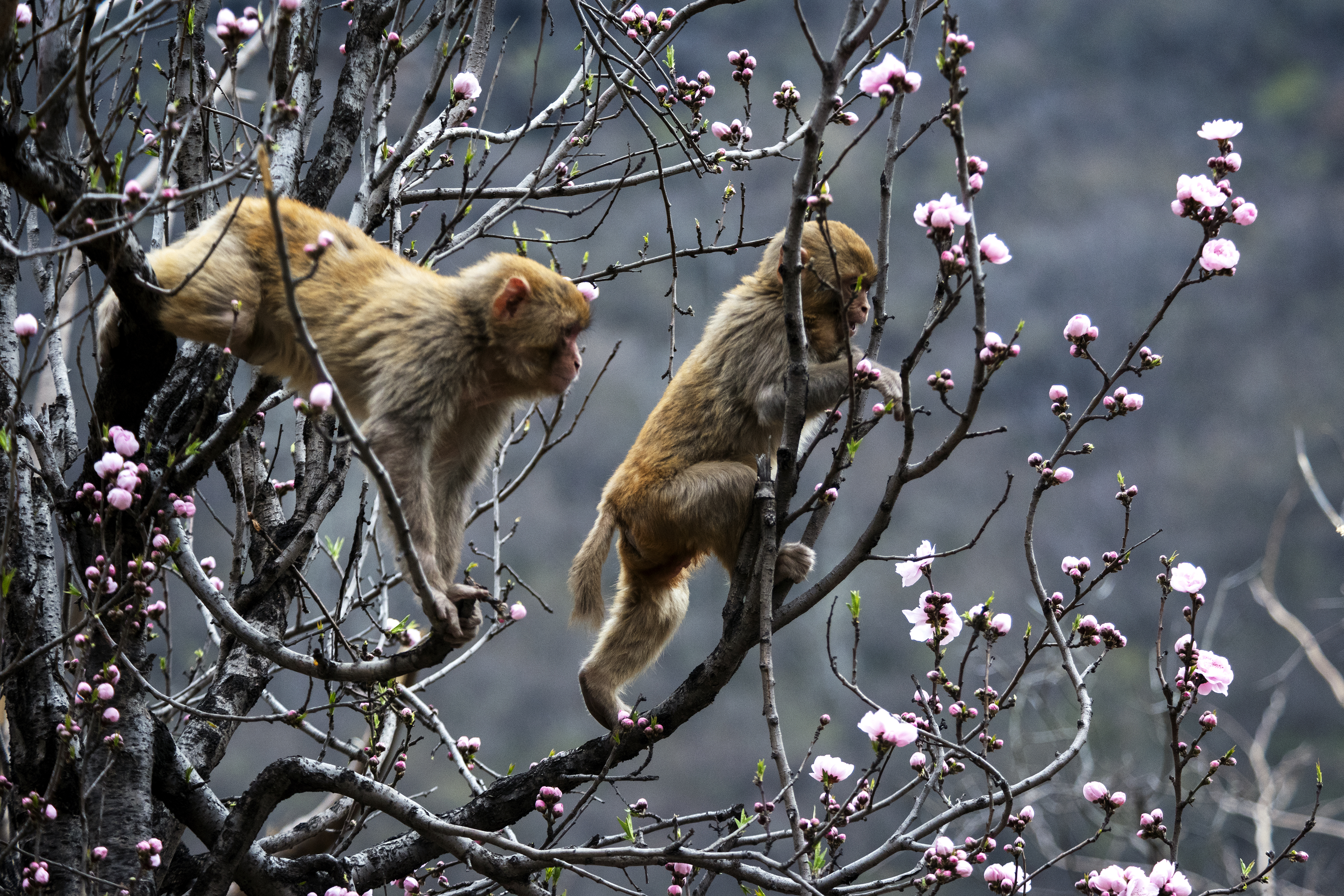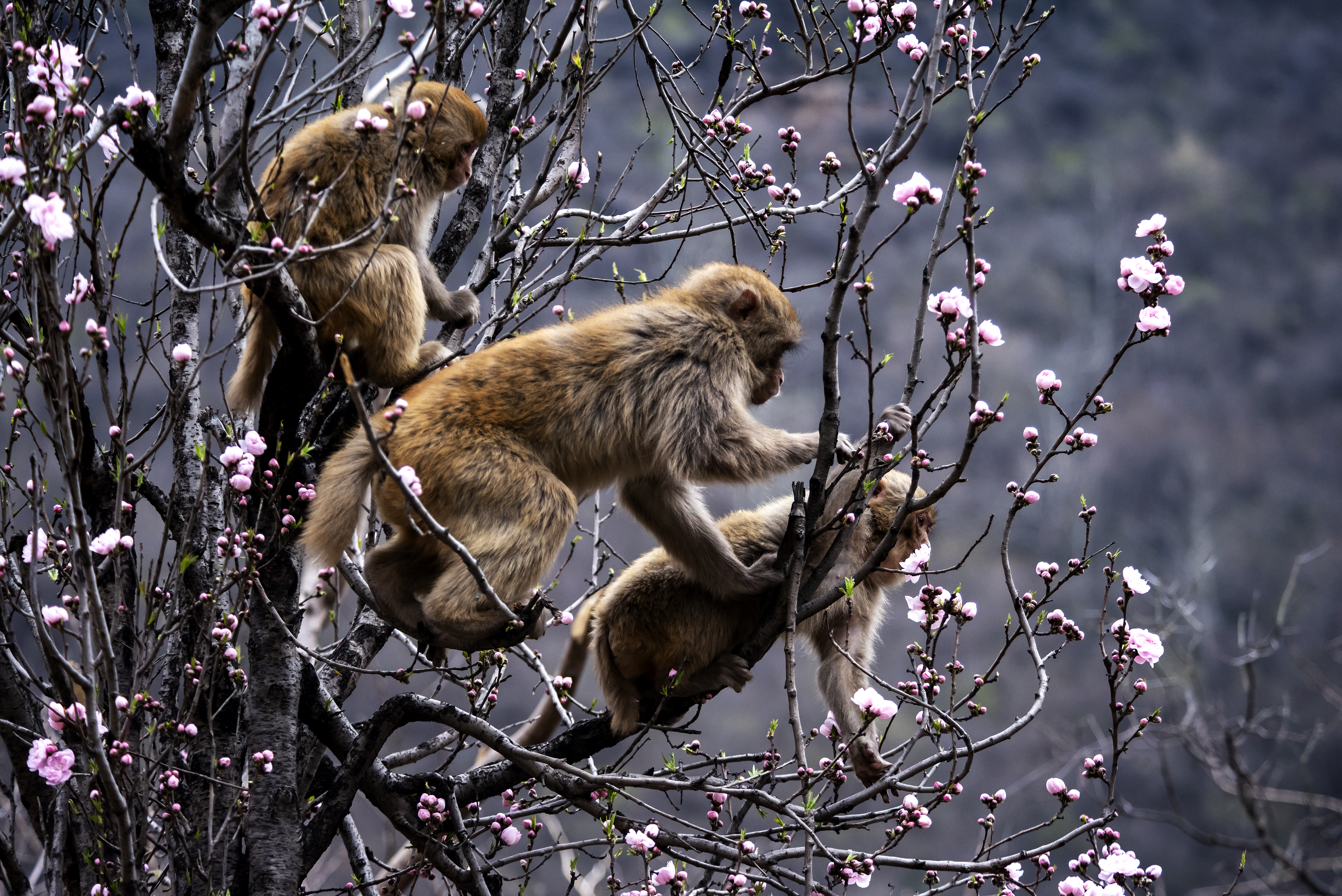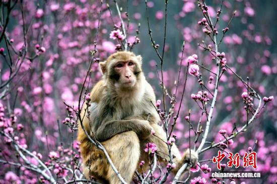 3月23日,河南济源五龙口国家级猕猴自然保护区内,太行猕猴穿梭于青山繁花之中。这些“太行精灵”或嬉戏追逐、或攀枝跃动,与春日美景相映成趣,勾勒出一幅鲜活生动的生态画卷。图为太行猕猴在花丛中追逐嬉戏。