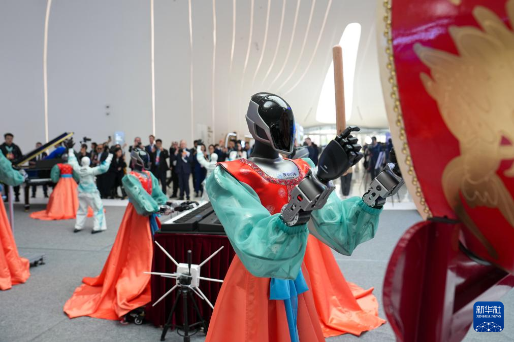 3月25日,在中关村国际创新中心,机器人在演奏乐器,表演舞蹈。