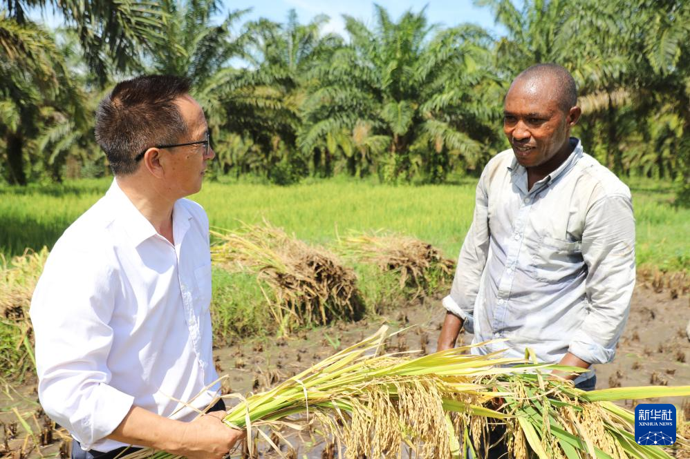 3月25日,在布隆迪布琼布拉省姆潘达县,中国援布农业专家组组长杨华德(左)和当地农业技术员麦乐斯交流水稻收获情况。