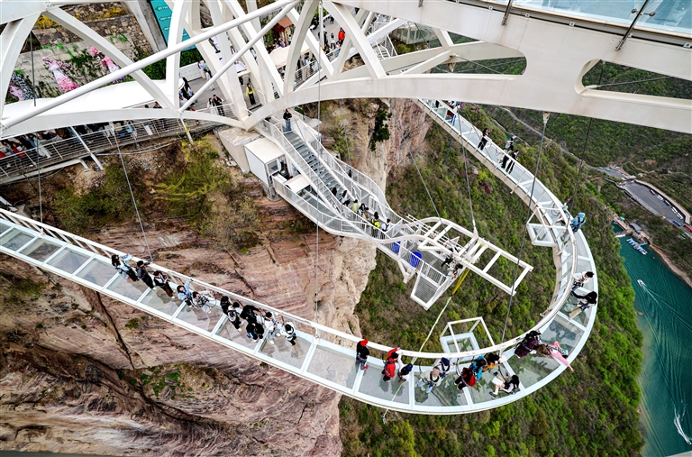 4月5日,游客在宝泉景区体验悬崖峭壁之上的玻璃栈道,感受高空行走的“云端心跳”。本文配图均为本报全媒体记者 邓放 摄