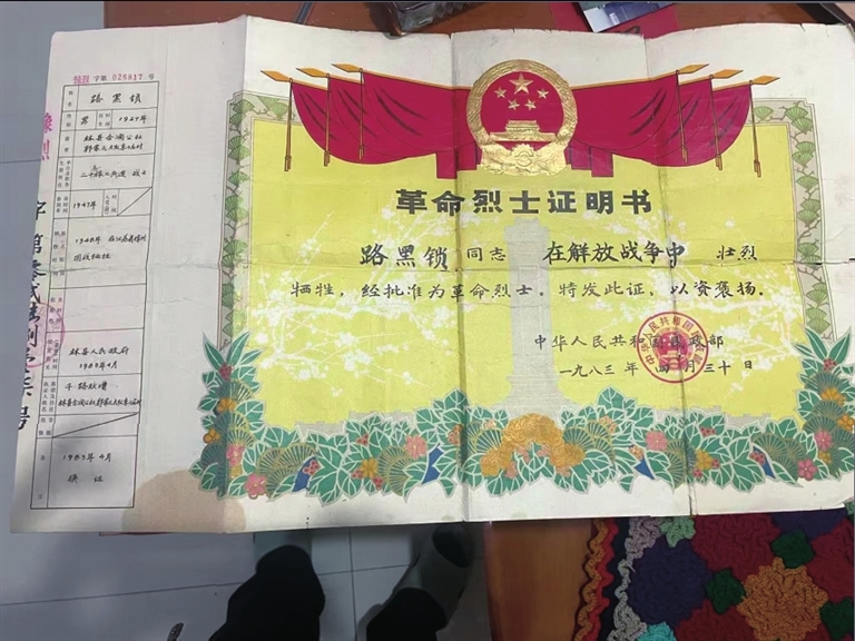 路向军把爷爷的名字、籍贯、参军时间一一告知。李女士认真核对信息,经多方查证,最终确认:路黑锁烈士牺牲于1948年淮海战役,葬在安徽濉溪县双堆集烈士陵园。