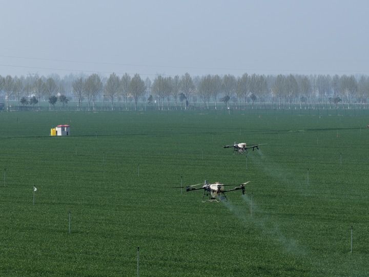 4月1日,飞防无人机在河南周口国家农高区小麦高产创建示范田作业(无人机照片)。新华社记者 李嘉南 摄
